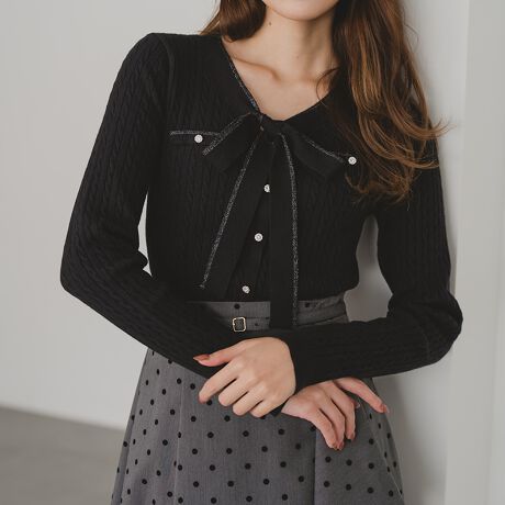 存在感あるケーブル編みと映えるボウタイで大人可愛く。2025秋冬新作 配色ボウタイケーブルニット