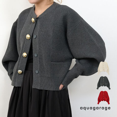 大きなゴールドボタンが目を惹く、存在感たっぷりのショート丈ニットカーディガン。