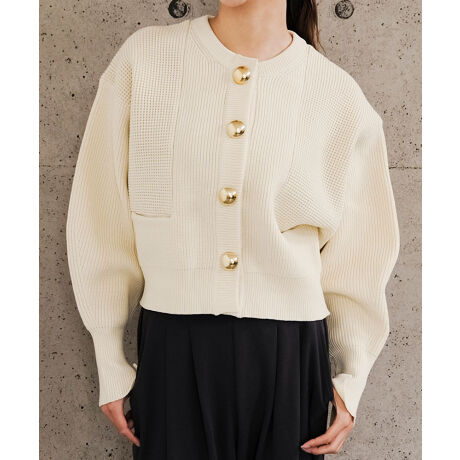 大きなゴールドボタンが目を惹く、存在感たっぷりのショート丈ニットカーディガン。