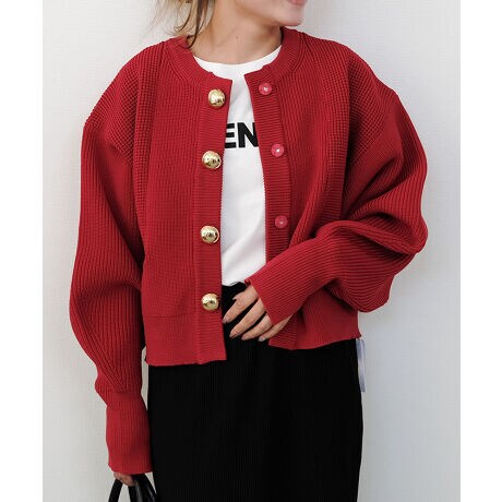 大きなゴールドボタンが目を惹く、存在感たっぷりのショート丈ニットカーディガン。