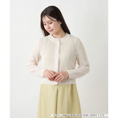 繊細な編み目が涼しげに映えるメッシュカーディガン。全体に施されたメッシュ編みが軽やかな透け感を生み出し、これからの季節らしい爽やかな着心地を実現しています。浅めのネックラインで仕上げ、きちんと感をキープしながらもモードな佇まいに。シルエットは腰にかかるくらいのショート丈でスタイル全体に軽快なリズムを演出。フロントはスナップボタン仕様で着脱もスムーズに行えます。