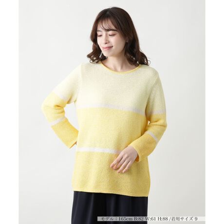 グラデーションカラーの美しい配色が目を惹く、クルーネックニット。柔らかく移り変わる色のコントラストが新鮮な印象を与え、リズミカルなラインが絶妙なバランスを生み出し、着こなしに軽やかなアクセントを添える一枚。さらりとした質感で春夏シーズンにも快適に着用できるのが魅力です。シルエットには適度なゆとりを持たせ、リラクシーな着心地を実現しました。デニムやワイドパンツと合わせてカジュアルに、スカートとコーディネートしてフェミニンにと、さまざまなスタイルで楽しめます。