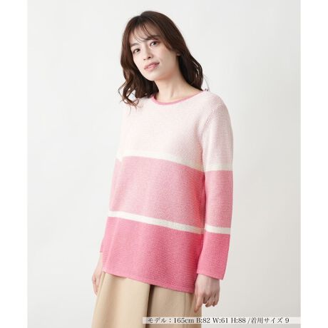 グラデーションカラーの美しい配色が目を惹く、クルーネックニット。柔らかく移り変わる色のコントラストが新鮮な印象を与え、リズミカルなラインが絶妙なバランスを生み出し、着こなしに軽やかなアクセントを添える一枚。さらりとした質感で春夏シーズンにも快適に着用できるのが魅力です。シルエットには適度なゆとりを持たせ、リラクシーな着心地を実現しました。デニムやワイドパンツと合わせてカジュアルに、スカートとコーディネートしてフェミニンにと、さまざまなスタイルで楽しめます。