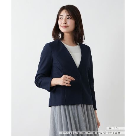 深めに開いたネックラインが絶妙な抜け感を生み出す、ショート丈のVネックノーカラージャケット。コットンや麻をブレンドした軽やかな風合いの生地を使用しており、さらりとした肌触りがこれからの季節にぴったり。涼しげな着心地と上品な佇まいを兼ね備えた一着です。すっきりとしたコンパクトなシルエットは、ロング丈のスカートやワンピースとの相性も抜群。ウエストラインを引き立て、スタイルアップ見せ効果も期待できるアイテムです。