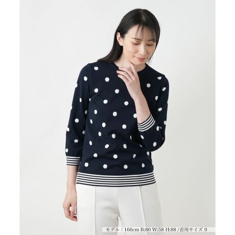 大粒のドットが愛らしくも品よく映えるクルーネックニット。シンプルなデザインに遊び心を添え、コーディネートに程よいアクセントをプラス。