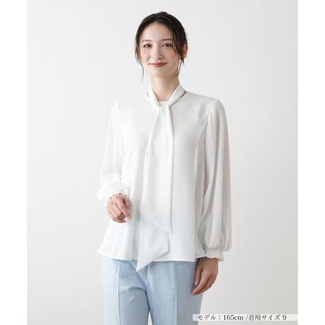 ボリューム感のあるボウタイが軽やかに揺れる、シーズンムードたっぷりのブラウス。身頃にはほどよくゆとりを持たせ、袖にはギャザーを寄せて、リラクシーなシルエットを構築。バックネックには涙あきを施し、上品な肌見せとともに、ボタン開閉が可能なデザインに。パンツと合わせればきりっとシャープな印象に仕上がり、ロングスカートでまとめれば優美な雰囲気のスタイリングが完成します。袖口はゴムシャーリングで心地よくフィット。オンにもオフにも映える、使い勝手のよいトップスです。