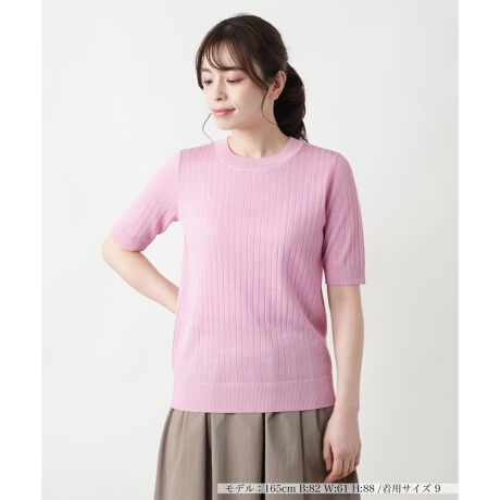 リブのように見えますが、特殊な編み方で縮みにくくしており、身体にピッタリと張り付きにくくラインを気にせずにお召し頂けます。