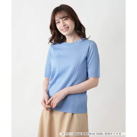 リブのように見えますが、特殊な編み方で縮みにくくしており、身体にピッタリと張り付きにくくラインを気にせずにお召し頂けます。