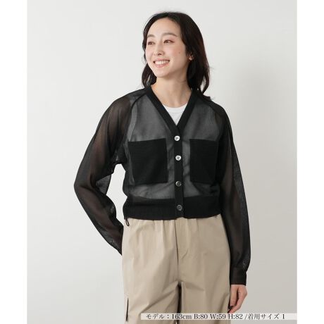 ほんのり透ける素材感が軽やかな印象のシアーカーディガン。透け感のある編地を用い、涼しげで春夏らしい装いを演出します。フロントの大きめなポケットがアクセントとなり、シンプルな中にもデザイン性をプラス。コンパクトな丈感でボリュームボトムとも好相性。羽織りとしてはもちろん、ボタンを留めてプルオーバー風にも楽しめる着回し力の高い一枚です。きれいめパンツやスカートと合わせて、品のある大人カジュアルコーデがおすすめです。