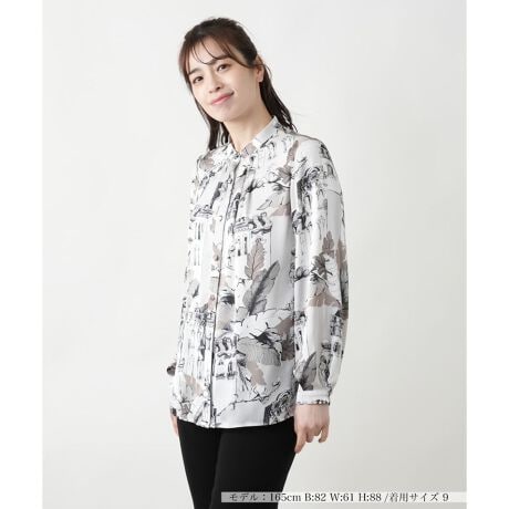 アートのような手描き風のプリントが個性を引き立てるバンドカラーブラウス。シルエットには程よいゆとりを持たせ、軽やかな着心地を実現しました。裾のサイドスリットが動きのある表情を演出し、こなれ感をプラス。フロントにはくるみボタンをあしらい、さりげなく上品なアクセントを添えています。シンプルなボトムスと合わせるだけで、ブラウスの柄が際立つ旬のコーディネートが完成します。
