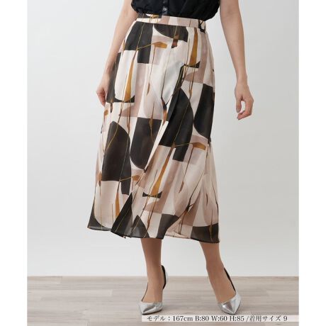 モダンアートを思わせる大胆なプリントが目を惹く、ロング丈のフレアスカート。程よくウエストシェイプしつつ、裾に向かって柔らかに広がる美しいシルエットも相俟って、大人の女性らしいエレガントな印象を演出。トップスをタックインすればウエストラインが強調され、スタイルアップ見せ効果も期待できそうです。シンプルなニットやシャツと合わせて上品に、カジュアルなカットソーでモードな雰囲気を楽しむなど、多彩なコーデで主役級の存在感を放つ一枚です。サイドホック&ファスナーにより開閉が可能。