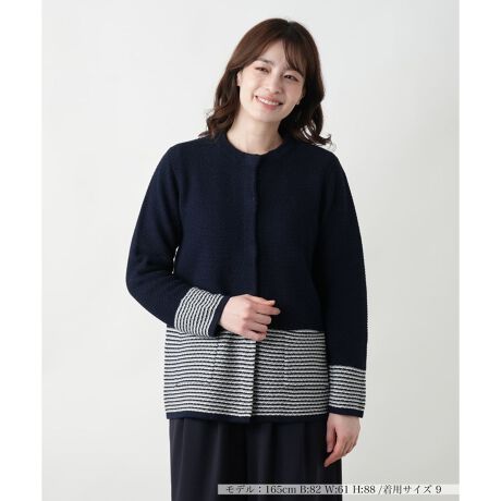 ざっくりと編み込まれた表情豊かな素材感のノーカラーニットジャケット。程よくゆとりを持たせたシルエットが、リラックス感を演出しながらも、上品な佇まいを作り出します。フロントは比翼仕立てですっきりとさせ、袖口や裾まわりにはボーダーの切り替えを施し、シンプルながらも遊び心のあるデザインに。爽やかなアクセントが加わることで、カジュアルにもシックにも馴染み、幅広いコーディネートが楽しめます。