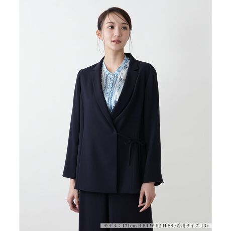 大人の女性らしいエレガントな着こなしを叶えるブレザー。フロントをクロスさせたカシュクールデザインが上級者らしい佇まいを演出。左サイドで結ばれたコードリボンがさりげないアクセントとなり、柔らかなニュアンスをプラス。フロントはスナップボタン仕様でスムーズな着脱が可能。単品使いでシンプルにまとめるのはもちろん、同素材のワイドパンツと合わせれば、統一感のあるセットアップコーディネートもおすすめです。