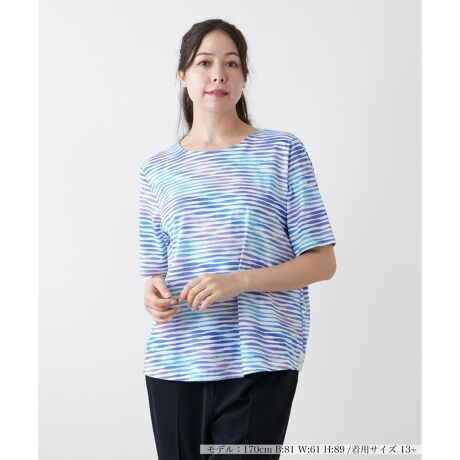 グラデーション調の美しい色合いで描かれたプリントの柄が視線を惹きつけるクルーネックカットソー。奥行きのあるカラーリングが季節感を引き立て、装いに爽やかなニュアンスを添えてくれます。生地にはナチュラルな風合いのコットンを使用しており、肌に優しく馴染み、軽やかな着心地を実現。シルエットには程よくゆとりをもたせ、リラクシーな着心地を叶えました。パンツでカジュアルにまとめるのはもちろん、スカートを合わせたフェミニンルックとも好相性。