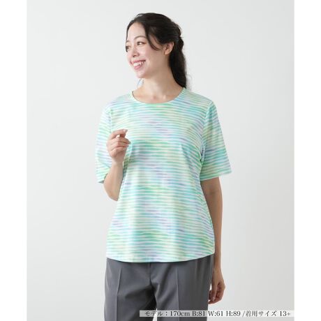 グラデーション調の美しい色合いで描かれたプリントの柄が視線を惹きつけるクルーネックカットソー。奥行きのあるカラーリングが季節感を引き立て、装いに爽やかなニュアンスを添えてくれます。生地にはナチュラルな風合いのコットンを使用しており、肌に優しく馴染み、軽やかな着心地を実現。シルエットには程よくゆとりをもたせ、リラクシーな着心地を叶えました。パンツでカジュアルにまとめるのはもちろん、スカートを合わせたフェミニンルックとも好相性。