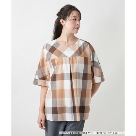 大きめのブロックチェックを、落ち着きのあるグラデーションカラーで表現したブラウス。クラシカルでありながらどこかモダンな印象を醸し出す一枚です。フロント中央にタックをあしらい、ゆったりとしたフォルムの中に美しい縦のラインをプラス。肩の力を抜いたシルエットと五分袖のバランスが、程よい抜け感とこなれ感を演出します。裾にはサイドスリットを施し、ボトムとのレイヤードも軽やかに。デニムを合わせたカジュアルコーデはもちろん、スラックスで品よくまとめるのもおすすめです。