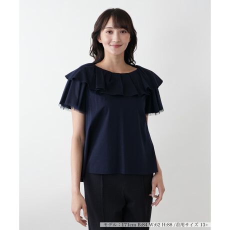 ぐるりと囲むようにあしらわれたサークル状のフリルカラーが、華やかな存在感を放つブラウス。小顔見せ効果もあり、甘すぎず上品な仕上がりが魅力です。袖には繊細なチュール素材を重ね、軽やかさとエアリーな抜け感をプラス。ふんわりとした揺れが、装いにさりげない動きを添えてくれます。ベースには程よい光沢感となめらかさを持つコットン混生地を使用しており、肌あたりはやわらかく、ストレスのないリラクシーな着心地も嬉しいポイント。