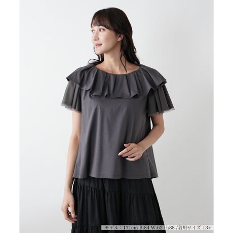 ぐるりと囲むようにあしらわれたサークル状のフリルカラーが、華やかな存在感を放つブラウス。小顔見せ効果もあり、甘すぎず上品な仕上がりが魅力です。袖には繊細なチュール素材を重ね、軽やかさとエアリーな抜け感をプラス。ふんわりとした揺れが、装いにさりげない動きを添えてくれます。ベースには程よい光沢感となめらかさを持つコットン混生地を使用しており、肌あたりはやわらかく、ストレスのないリラクシーな着心地も嬉しいポイント。