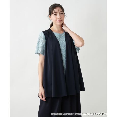 ドライタッチなスムースジャージー素材を使用したジレ。肩部分にタックを入れて、フレアを出したデザインにしているので軽やかな印象です。ボタンレスなので気軽にでさらっと着用出来ます。