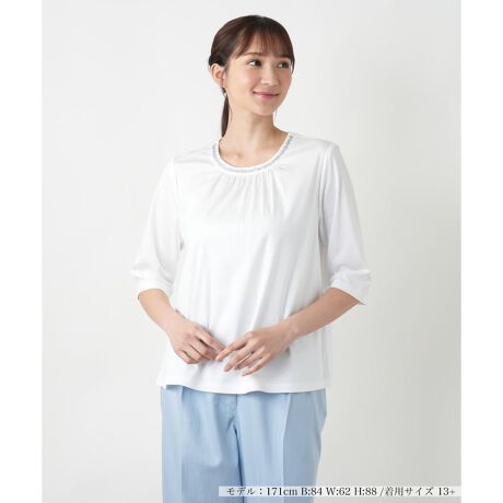 大人の女性らしいエレガントな雰囲気を纏う、クロップドスリーブのカットソー。ネックラインにさりげなく煌めくスパンコールをあしらい、リュクスなアクセントをプラス。フロントにはギャザーを施し、柔らかなニュアンスに。すっきりとしたシルエットで合わせるボトムスを選ばず、カジュアルからきれいめまで幅広いスタイリングに対応する一枚です。バックネックの涙あきはボタン開閉が可能。