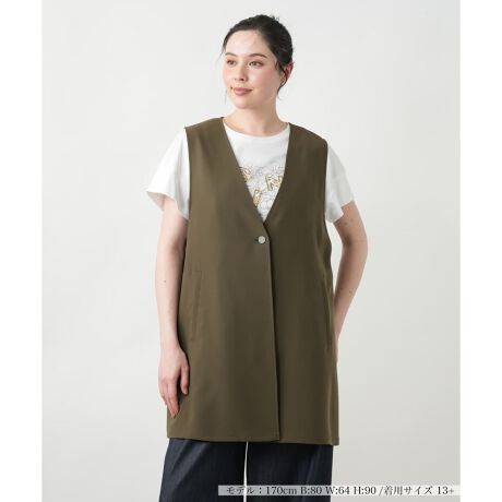 程よくゆとりのあるシルエットとセミロング丈が、今の気分にぴったりのVネックベスト。深めに開いたネックラインがデコルテをすっきり見せ、シーズンらしい軽やかな抜け感を演出。装飾を抑えたミニマルなデザインで、Tシャツからブラウス、ニットまで多彩なトップスと好相性。後ろ身頃にはギャザーを施し、シンプルな中にもさりげない表情をプラスしました。サイドにあしらわれた飾りボタンがアクセントになり、さりげない個性を添えてくれます。