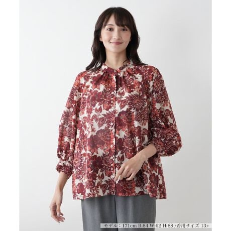 美しい色合いで大胆に表現されたフラワー柄がインパクトを放つバンドカラーブラウス。ふんわりと立体感をもたせたスリーブラインと、空気をはらんだような軽やかなシルエットが、着る人に柔らかさと品のある華やぎを与えます。裾にはさりげなくサイドスリットを施し、動きに合わせて揺れる抜け感がこなれた印象を演出。デニムでカジュアルに、スラックスでエレガントに、幅広いスタイルにマッチする主役級のアイテムです。
