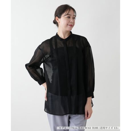 【店舗人気】バンドカラー比翼ブラウス【プラス企画】