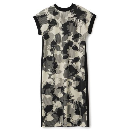 LANVIN COLLECTIONオリジナルのローズプリントのスムース生地と程よい厚みが魅力のミラノリブニットを前後でドッキングしたワンピース。