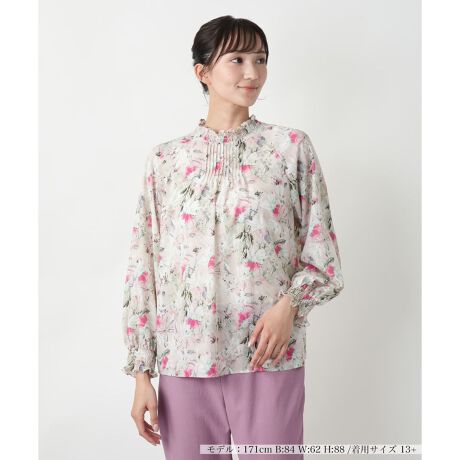 水彩画のように繊細で優美なフラワープリントが印象的なブラウス。薄手の生地が空気をはらみ、ふわりと広がる軽やかなシルエットを描きます。ネックラインにはフリルをあしらい、首元にさりげない華やぎをプラス。前後に施されたピンタックが立体感を生み、甘さと上品さが程よく調和した一枚。襟と袖口はゴムで心地よくフィット。ワイドパンツと合わせてナチュラルに、スカートと合わせればフェミニンにと、着こなしの幅が広がります。バックファスナーにより開閉が可能。