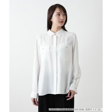両胸にレイアウトされたフラップポケットが存在感を放つブラウス。端正な襟元がシャープな印象を与えつつ、上品な佇まいを演出。フロントには比翼仕立てを採用し、すっきりとしたミニマルな表情を生み出しています。アンティークのようなパール調ボタンがさりげなく輝き、クラシカルなエッセンスをプラス。シンプルながらもディテールにこだわった一枚は、スカートでまとめてフェミニンに、パンツと合わせてマニッシュにも着こなせるアイテムです。