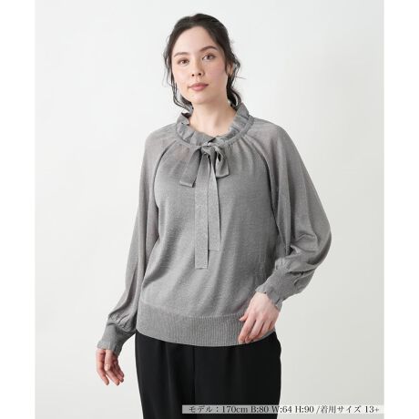上品なラメ感が華やかさをプラスするリボンタイ付きニットプルオーバー。デコルテを美しく見せるラウンドネックに、ミニマルな衿とリボンディテールをあしらい、フェミニンな印象に仕上げました。柔らかなニット素材が心地よく体に馴染み、ゆったりとしたシルエットが女性らしさを引き立てます。袖口と裾はリブ仕様で、メリハリのあるデザインに。デイリーからオフィスシーンまで、幅広く活躍する一枚です。スカートと合わせてエレガントに、デニムと合わせてカジュアルダウンもおすすめ。