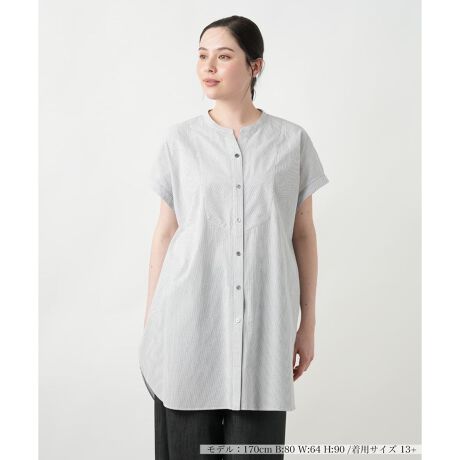 細いストライプのリップル生地を使用した、シーズンムードを呼び込むスキッパーブラウス。フロントのボザム切り替えでストライプの向きを巧みに変えることで、視線を惹きつける繊細なニュアンスをプラス。バックスタイルにはタックを施して立体感のあるシルエットに。裾はラウンドカットで軽やかに仕上げられ、やわらかなコクーン感を生み出しています。季節らしい抜け感と爽やかさを持つ、大人のための一枚です。