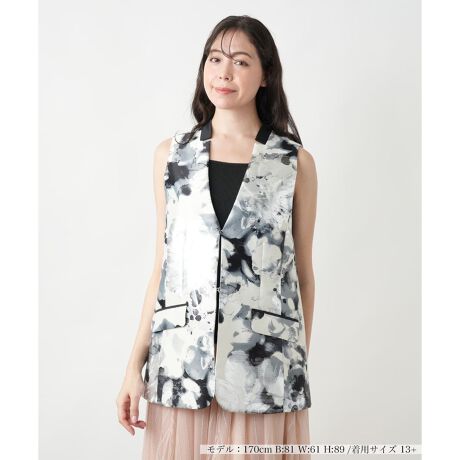 モノトーンの濃淡とラメで表現されたフラワー柄が、シックでありながら存在感を放つカラーベスト。まるでアートのような柄がコーディネートをひと味違った趣に仕上げます。襟元には配色を施し、フラップポケットとともにアクセントに。ヒップまで隠れる長めの丈感で気になる体形をカバーしつつ、バランスよく着こなせるのも嬉しいポイント。シャツやカットソーとレイヤードするだけで、こなれたスタイルが完成する主役級のアイテムです。フロントはホックにより開閉が可能。