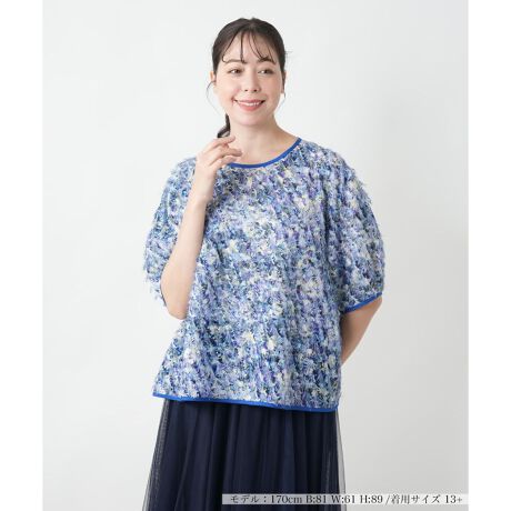 繊細なフェザーを思わせるモチーフが、インパクトのある表情を生み出すブラウス。豊かな質感とニュアンスカラーが奥行きのある華やかさを演出。クロップドスリーブが軽やかな抜け感をプラスし、ゆったりとしたリラックスシルエットも相俟って余裕を感じさせるデザインに。ネックラインはすっきりと開きをもたせ、顔周りを明るく見せる効果も。さりげなく取り入れた配色のパイピングがアクセントになっています。シンプルなアイテムと合わせるだけで主役級の存在感を放つトップスです。