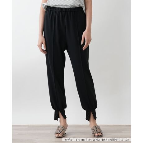 ストレッチの効いたポリエステル素材で仕立てた、しなやかなはき心地のパンツ。センタープレスが縦のラインを強調し、ゆったりとしたシルエットながらもスマートな印象を演出。レッグラインを拾わず、自然に体形をカバーしてくれるのも嬉しいポイント。ウエストはノンストレスな総ゴム仕様で、さっとはけて着こなしも自在。裾にあしらったスリットが足元に軽やかな抜け感を添え、オンでもオフでも頼れる今どきバランスの一本です。