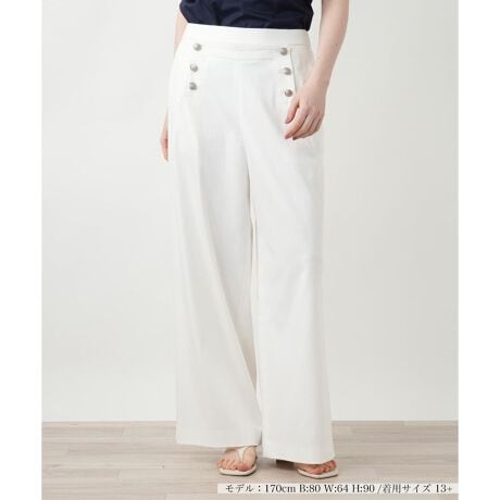 ハイウエスト&ワイドシルエットが美しいバランスを描く、、マリンテイストなデザインが魅力のワイドパンツ。カジュアルな素材ながらも落ち着いたカラーリングで大人の上品さを演出します。フロントのメタルボタンがアクセントとなり、シンプルなトップスと合わせてもスタイリングに華を添えてくれる一着。脚のラインを拾わず、すとんと落ちるシルエットが、歩くたびに動きのある印象に。春夏の軽やかな装いにぴったりな一枚です。フロントは飾りボタンになっており、サイドファスナーで開閉が可能です。