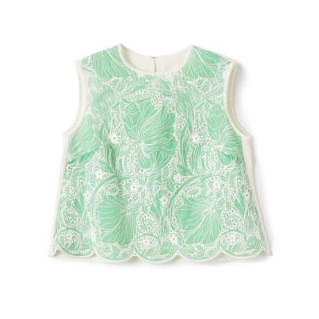 立体感と繊細さのあるアイレット刺繍を施したエンブロイダリーレースとニットをドッキングしたノースリーブトップス。