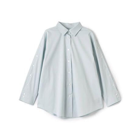 一見ベーシックなシャツブラウスは袖にボタンを取り付けることでケープのようにも着用できる遊び心をプラス。