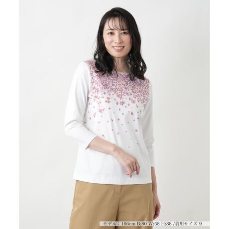 フロント部分に小花柄がグラデーションのようにデザインされた七分袖カットソー。