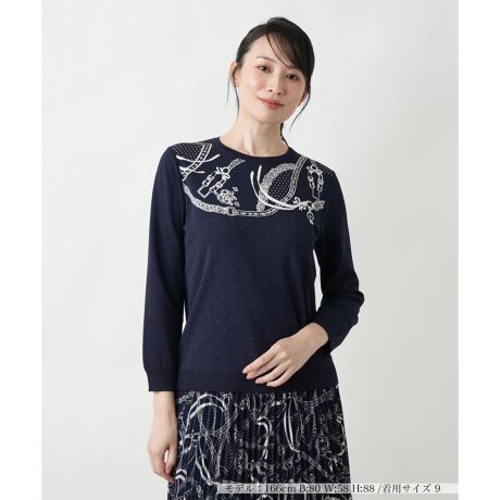 クラシックな馬具柄が胸元を華やかに彩る長袖ニットトップス。