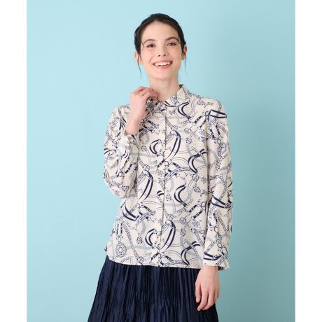 しなやかな落ち感のポリエステルデシン素材にチェーンやベルトなどを織り交ぜた柄をプリントしたブラウス。さらりと肌触りの良い素材感が特長です。さり気なく前後差をつけています。程よくヒップもカバーする丈もポイント。無地のインナーを合わせて羽織りブラウスとしても着用でsきます。