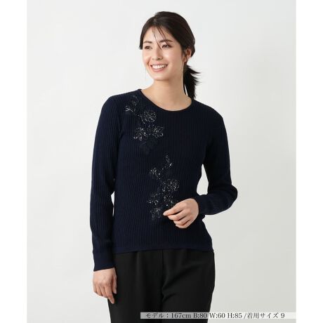 スパンコールが煌めくレース使いのフラワーモチーフをあしらい、華やかさとリュクス感を兼ね備えたクルーネックニット。全体にリブ編みを施し、縦ラインを強調することで、すっきりとしたシルエットを演出。程よいフィット感がありながらも窮屈さを感じさせず、快適な着心地を叶えます。ネックラインは浅めにデザインし、落ち着いた上品な佇まいに仕上げました。シックなカラーでボトムスとも相性がよく、オンオフ問わず活躍する着回し力に優れた一枚です。