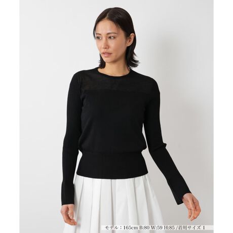 上品な透け感が魅力のシアー切替プルオーバー。デコルテ部分にさりげない透け感を取り入れることで、女性らしい洗練された印象をプラスしました。ボディは程よいフィット感のあるシンプルなデザインで、スタイルアップ見せを叶えつつ快適な着心地を実現。スリーブはリブ編みからの袖口はフレアシルエットになっており、手元をエレガントに演出します。シンプルながらも細やかなディテールにこだわった一枚は、スカートやデニムと合わせたカジュアルスタイルはもちろん、ジャケットのインナーとしても活躍します。