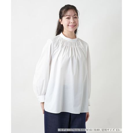 襟元にシャーリングを寄せたプルオーバーブラウスです。程よい張り感とストレッチ性のあるポリエステル・コットン・ポリウレタン素材を使用しています。ふんわりとしたシルエットが魅力の若々しいデザインです。