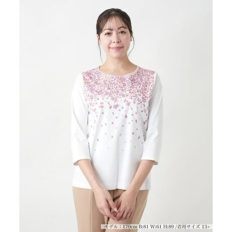 フロント部分に小花柄がグラデーションのようにデザインされた七分袖カットソー。