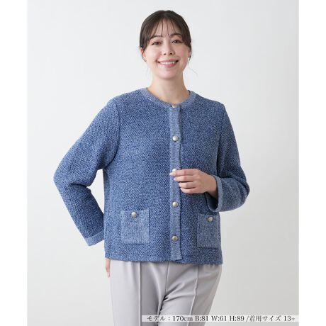 ツイード調の編み地が上品な雰囲気を醸し出すカーディガンです。