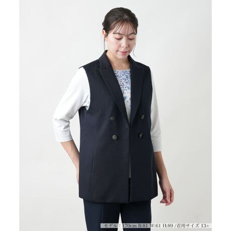 アンティーク調の釦がアクセントのマニッシュなジレ。ダブルに見せかけた突き合わせデザインなので重くならずすっきりとした着こなしに。