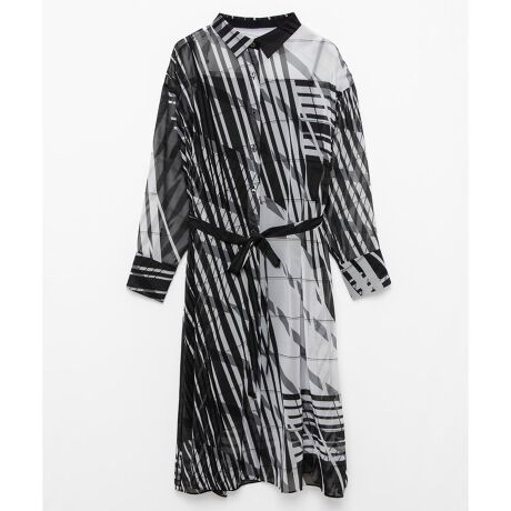 このシャツワンピースは、透明感のある軽やかな素材に幾何学模様が映えるエレガントなデザインです。ゆったりとしたシルエットながら、付属のウエストリボンでシルエットを引き締めることができ、スタイルアップも可能。前開きのボタンデザインで羽織りとしても活用できる汎用性の高いアイテムです。長袖仕様でシーズンを問わず着用しやすく、洗練された都会的な雰囲気を演出します。上品さとカジュアル感を兼ね備えた一着です。