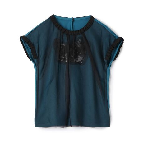 光沢感とレーヨンとナイロンの組み合わせで光沢感と膨らみ感を表現したニットトップスにフラワーモチーフとチュールを組み合わせたLANVIN COLLECTIONらしさの詰まった一枚。
