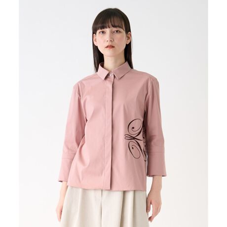 パリッとしたハリのあるコットンベースのテキスタイルでクリーンに決まるカラーシャツ。左サイドにあしらった大胆な刺繍が、スタイリングに深みと華やぎをもたらします。こっくりとしたくすみカラーで気品も抜かりなく。